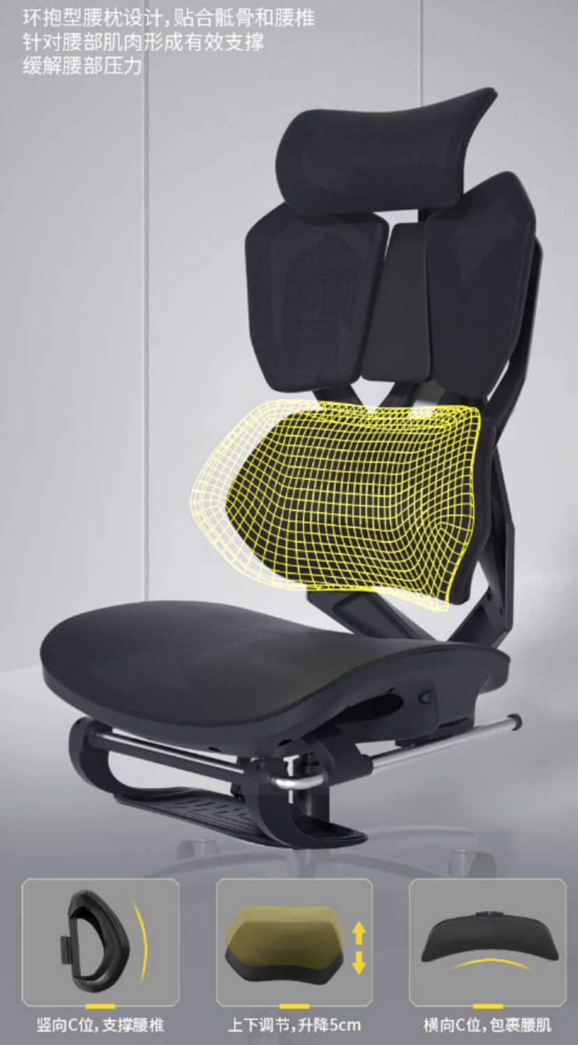 •双 C 型环抱腰枕:升降可调,横向包裹+纵向托扶,解决腰枕“顶不住”“顶错位”的行业通病。纵向支撑,横向包裹(竖向的C型曲线能够支撑腰部,横向的C型曲线能够对腰部肌肉形成有效包裹),不管你怎么扭都能紧密的贴合骶骨、腰椎,缓解腰部压力,解决了传统赛车电竞椅笔直椅背结构存在的对用户腰背缺乏支撑不足的问题,让玩家在游戏过程中更专注,久坐不累。