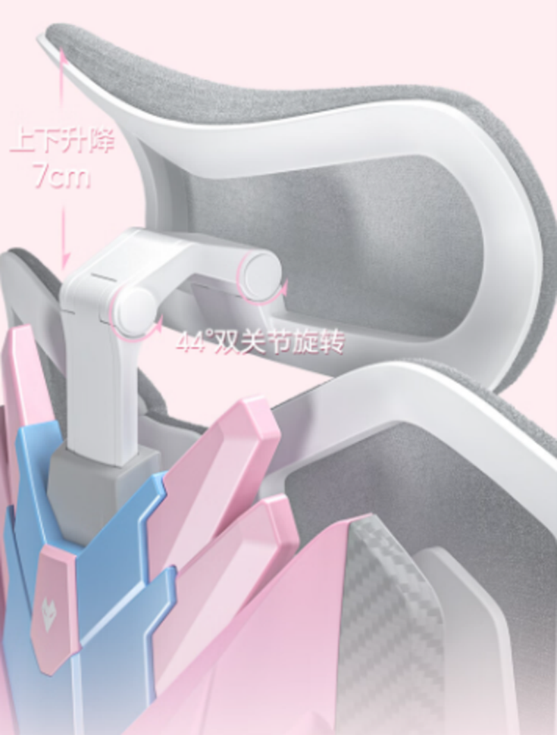 女孩的脖子更细更敏感,固定头枕只会“顶发型”。骁骑用 双关节动态头枕(升降 + 44°角域调节),让支撑贴到颈椎而不是后脑勺 。骁骑让小个子女生不被身高所限制,根据人体颈椎生理曲度设计,采用业界少有的3D可调双关节头枕(具备升降,及大角度调节功能),支持上下7cm的升降,并且两个关节都能进行角度44°旋转调节,能满足不同人群对头枕高度、贴合度、角度需求,支撑更精准,颈部不易酸痛。