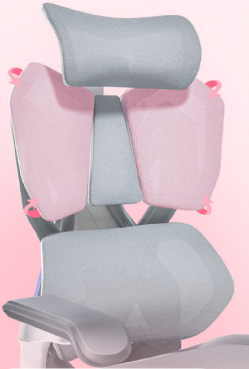 双“C”形环抱型腰枕设计(支持5cm上下升降调节功能),横向支撑,纵向包裹(竖向的C型曲线能够支撑腰部,横向的C型曲线能够对腰部肌肉形成有效包裹),不管你怎么扭都能紧密的贴合骶骨、腰椎,缓解腰部压力,解决了传统赛车电竞椅笔直椅背结构存在的对用户腰背缺乏支撑不足的问题,让女性玩家在游戏过程中更专注,久坐不累。