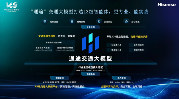 随着以大模型为引擎的交通智能体感知、思考、推理和交互能力的飞速发展,L3级交通智能系统将加速落地,在绝大多数场景下自主运行。基于多年历史积累的PB级交通大数据平台,在国产算力底座的支撑下,海信今年正式推出面向城市交通行业的L3级智能体——通途大模型。萃取百余个城市业务经验,构建道路交通行业知识库,对通用模型进行自主微调,相对通用大模型更专业、能实战。